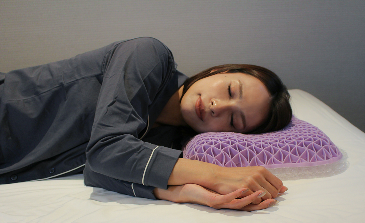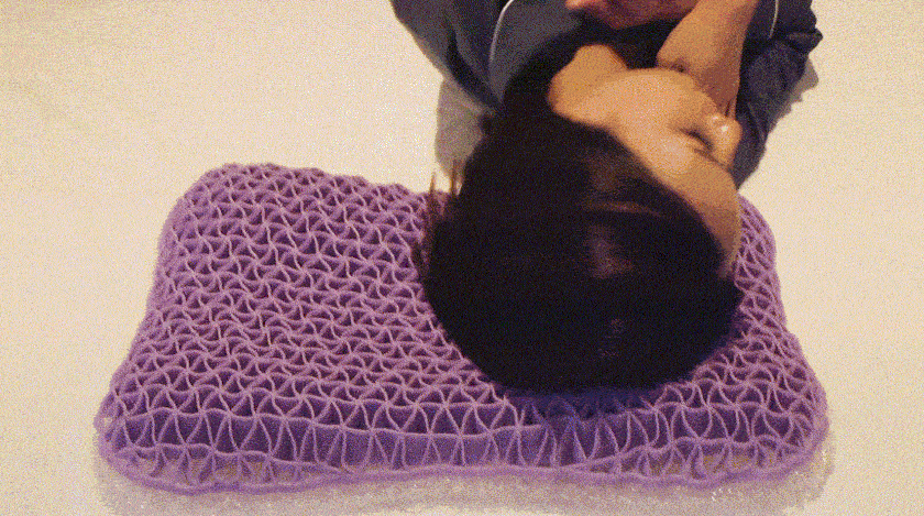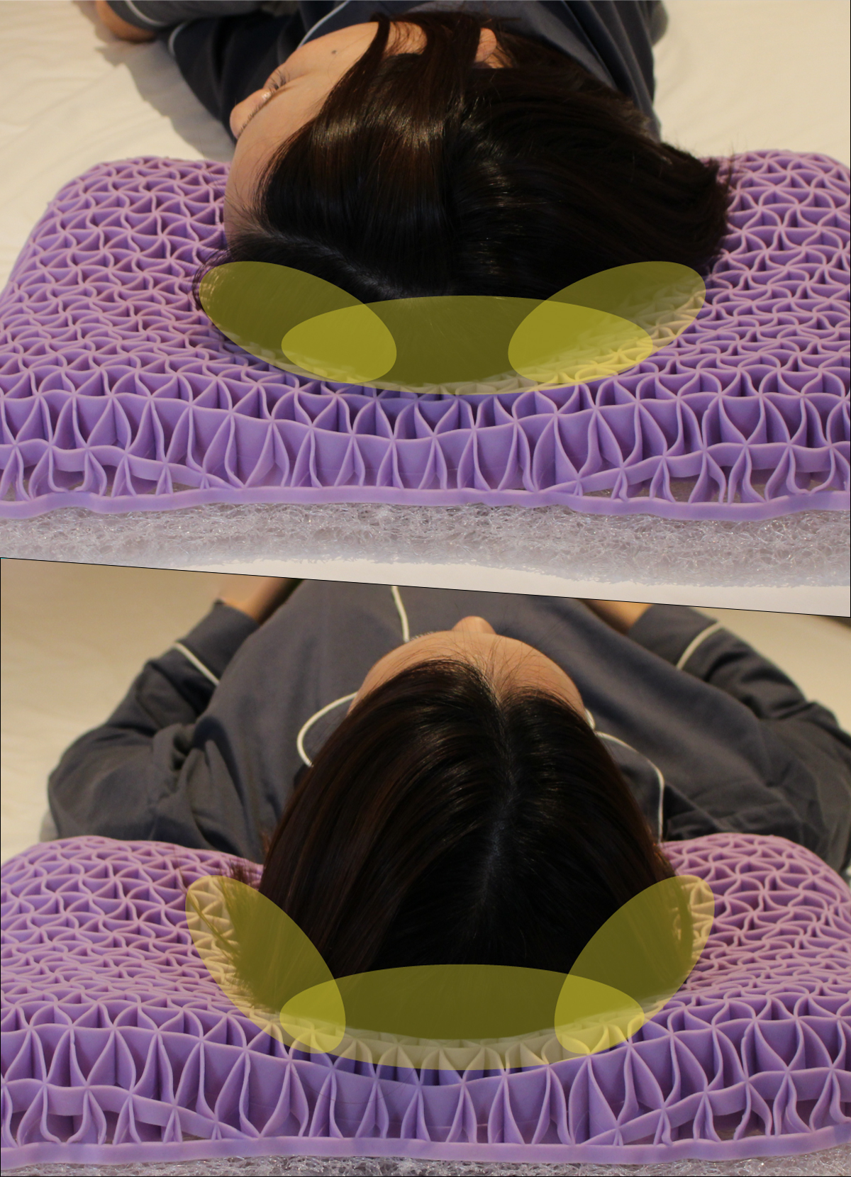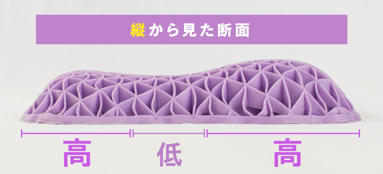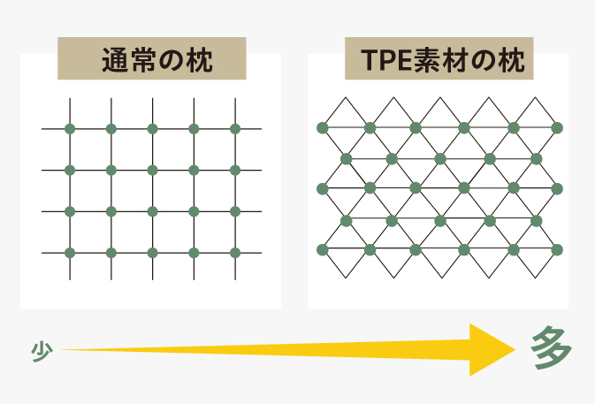 三角格子構造は、頭部の形と位置に合わせて瞬時にフィットします。従来の枕と比べるとTPE素材の方が点の数が多く、頭をしっかり支える構造になっています。