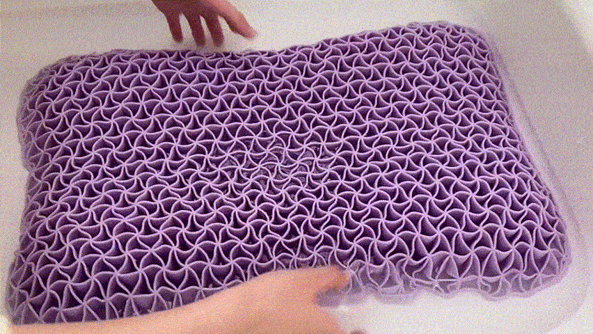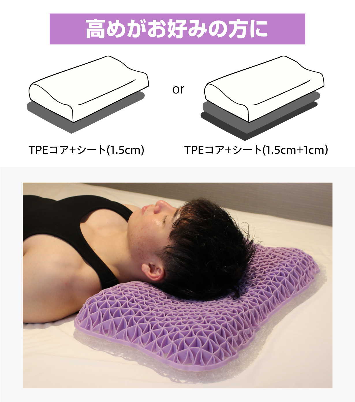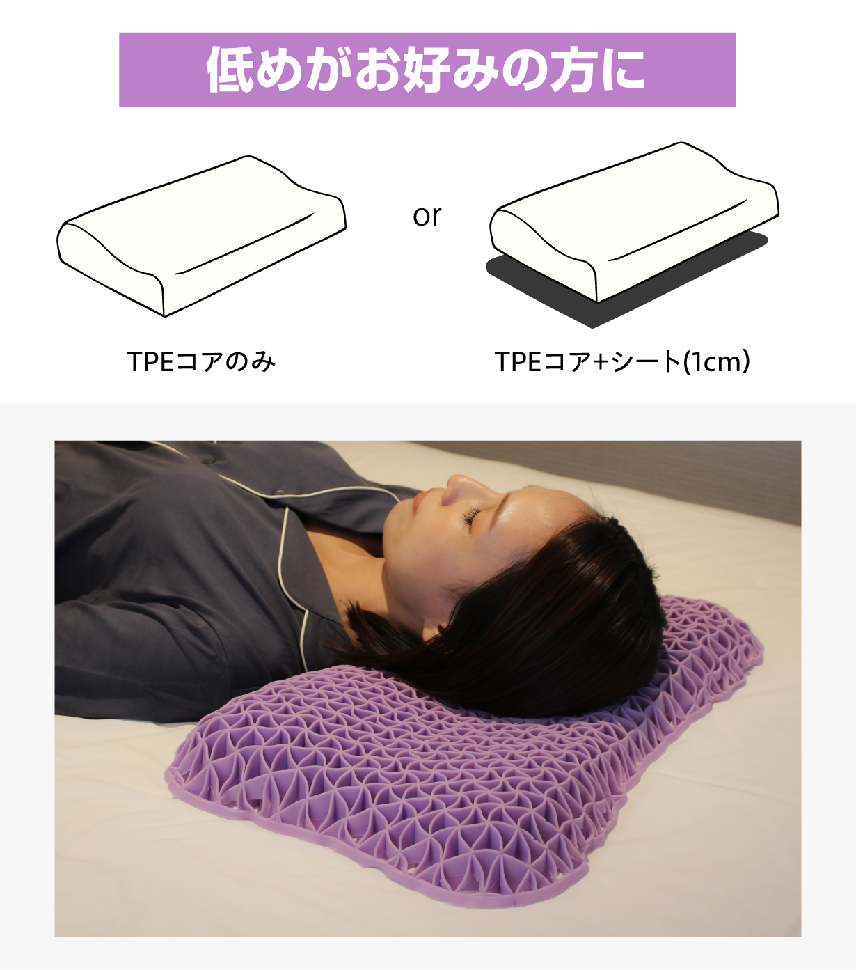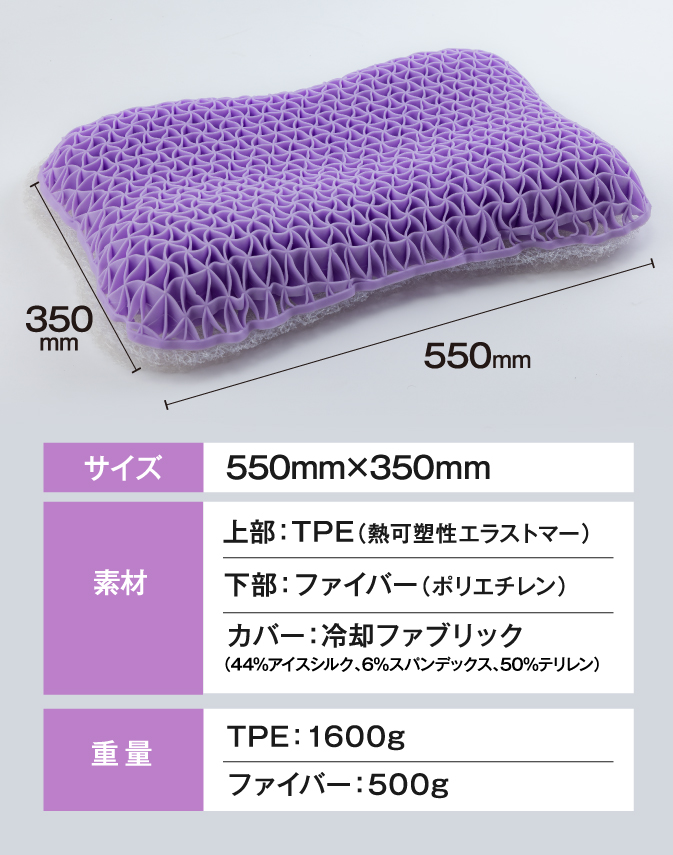 三角格子構造は、頭部の形と位置に合わせて瞬時にフィットします。従来の枕と比べるとTPE素材の方が点の数が多く、頭をしっかり支える構造になっています。