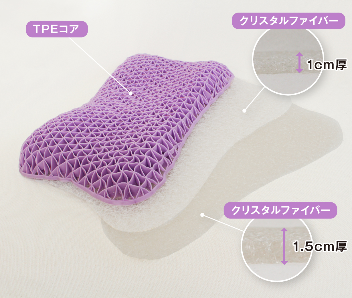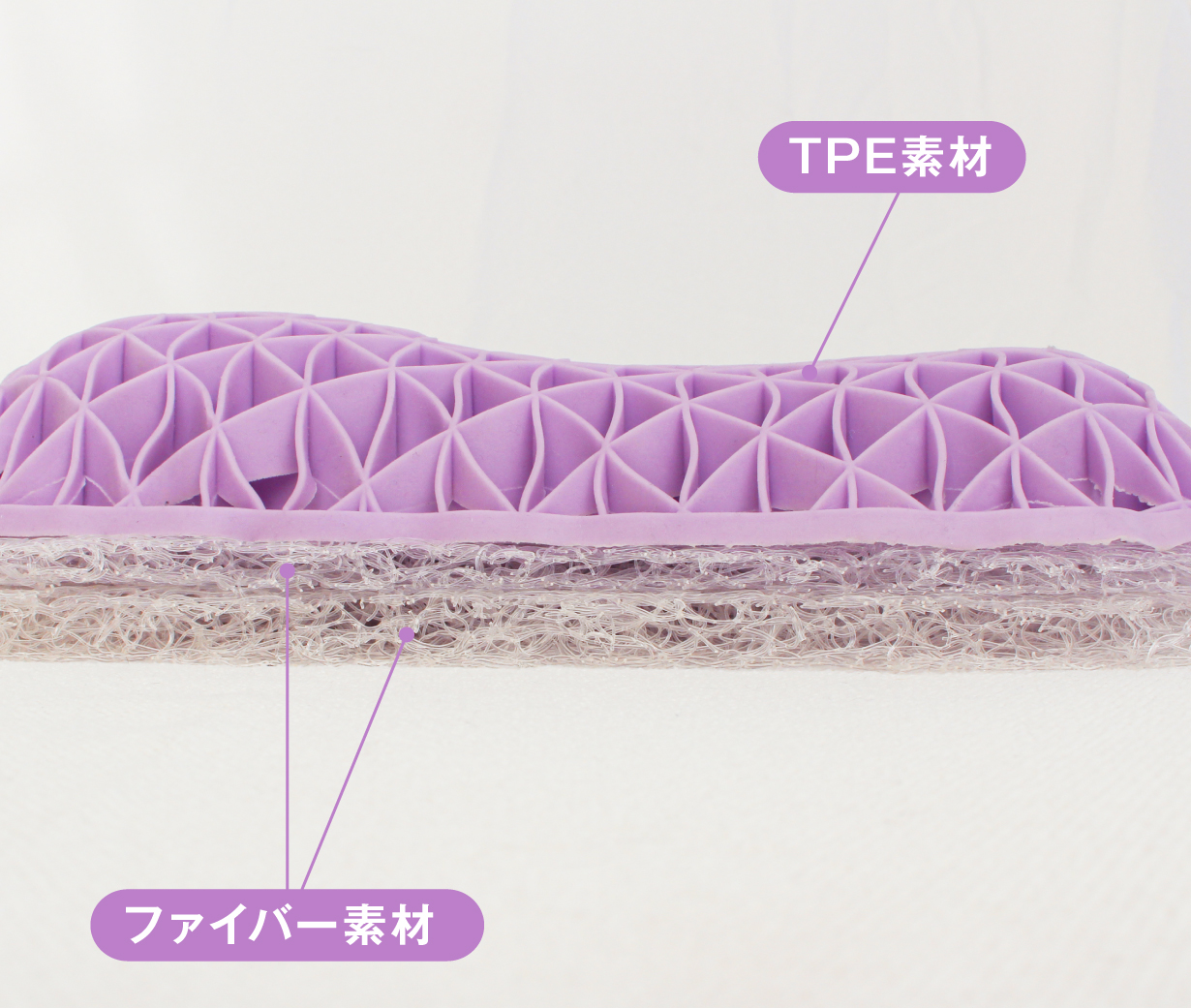 今回開発した枕はこのように、1層目・2層目にファイバー素材、3層目にTPE素材という従来にはない特殊構造となっております。