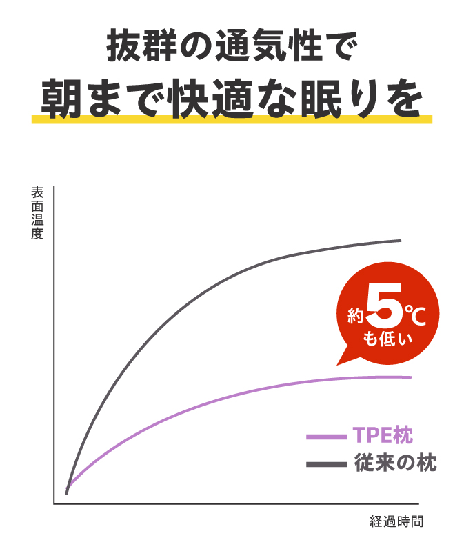このようにTPE素材とファイバー素材は通気構造となっているため圧倒的に従来の枕より通気性が優れています。