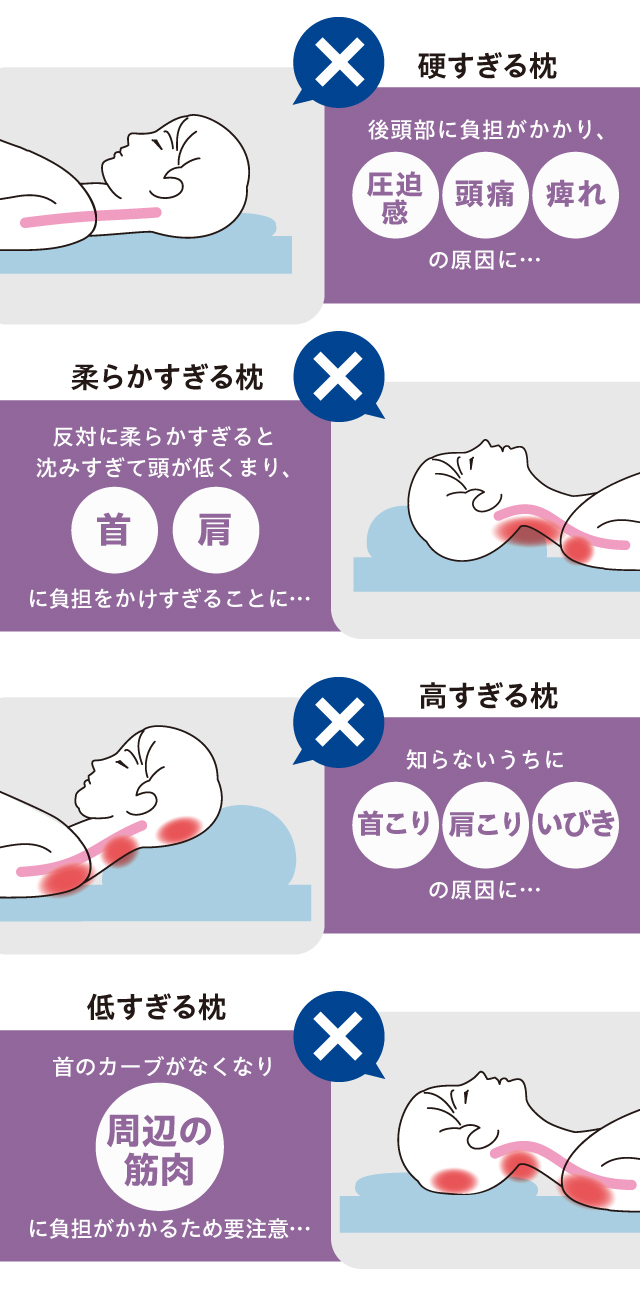 枕の高さ・硬さが自分に合っていれば肩や首に掛かる負担を減らすことができ、睡眠中の頭痛、起床時の首こりや肩こりを起こすことが減ります。
